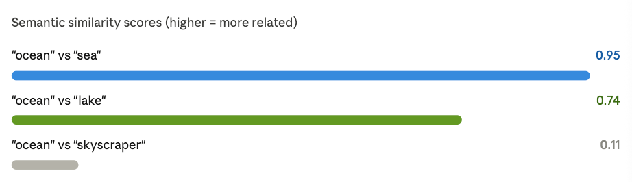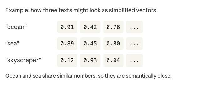 That’s the magic. The words “ocean” and “sea” don’t mean exactly the same thing, but their vectors end up very close together in this numerical space. “Ocean” and “skyscraper”? Miles apart.