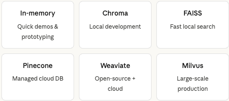 LangChain supports everything from a lightweight in-memory store for quick testing all the way to production-grade databases for real applications.